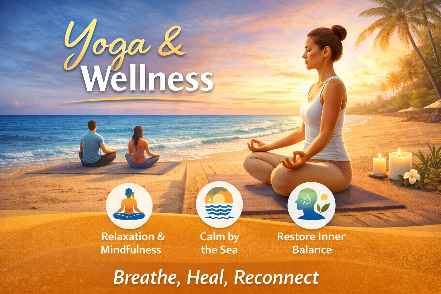 Reconnect with your body, mind & breath through peaceful yoga & wellness experience by the sea. Set against the soothing sounds of waves & fresh coastal air to help you slow down, stretch gently, and restore inner balance. Morning sessions welcome the day with gentle movements & guided breathing, while evening practices help release stress & prepare the body for deep rest. Combined with the calming beach environment, yoga becomes more than an exercise—it becomes a way to reconnect with yourself. .